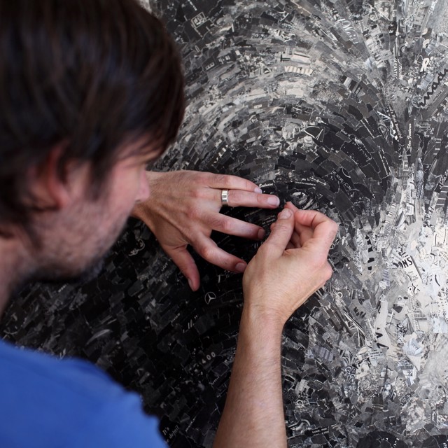 Kelly says that he thinks of his collage form as similar to a DJ’s process of sampling parts of music and bits of sound to create a new song. The natural and urban worlds fuse, and time starts to overlap as images from different eras coexist and create new meaning in the juxtaposition of elements. A classic American car may park next to sheet music, chickadees, and mid-century motel signage, while in another piece, vintage Vogue models may be paired with aspen trees and found love letters, all under a silky gloss of resin. “I chose to paint with paper and various printed materials in order to achieve a unique depth in my work. By allowing the viewer to first see a complete, near photorealistic image from a distance, and then, upon a closer look, to explore the many individual textures and bits of text, I am able to add layers of meaning to each piece. I love the effect that thousands of little bits of paper, all taken out of context, come together to create something new. I feel art should inspire, transport, and hopefully awe the viewer; that is certainly my intention with this series of collages.”