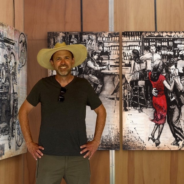 Since 2002, Will Armstrong has spent twenty weekends a year away from home, traveling over half a million miles in well-used vehicles. His work captures countless stories from honky tonks, movie palaces, inexpensive motels, and musicians. Recently, he relocated with his wife and family to Santa Fe, New Mexico. Will’s art reflects the music that defines these places, influenced by artists such as Bob Wills and Johnny Cash. As a stand-up bass player, he now channels his passion into creating art with an oil-based pen on vintage maps and sheet music, adding an acrylic wash for a painterly effect.