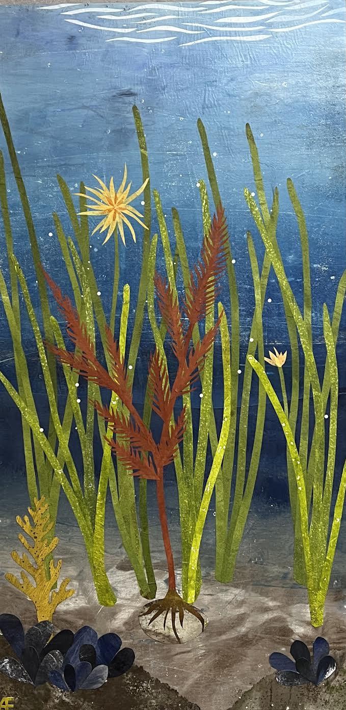 Amy paints her backgrounds and then applies handmade paper, hand painted paper, purchased papers and maps to create unique landscapes. Her favorite tools are scissors, rotary cutters and X-acto knives.Influenced by the art of Henri Rousseau and Rex Ray, she creates unique garden scenes and landscapes. Her current pieces show flower gardens responding to the environment in which they are placed. The “flowers” grow in the dark of night as well as under a brilliant light from above .