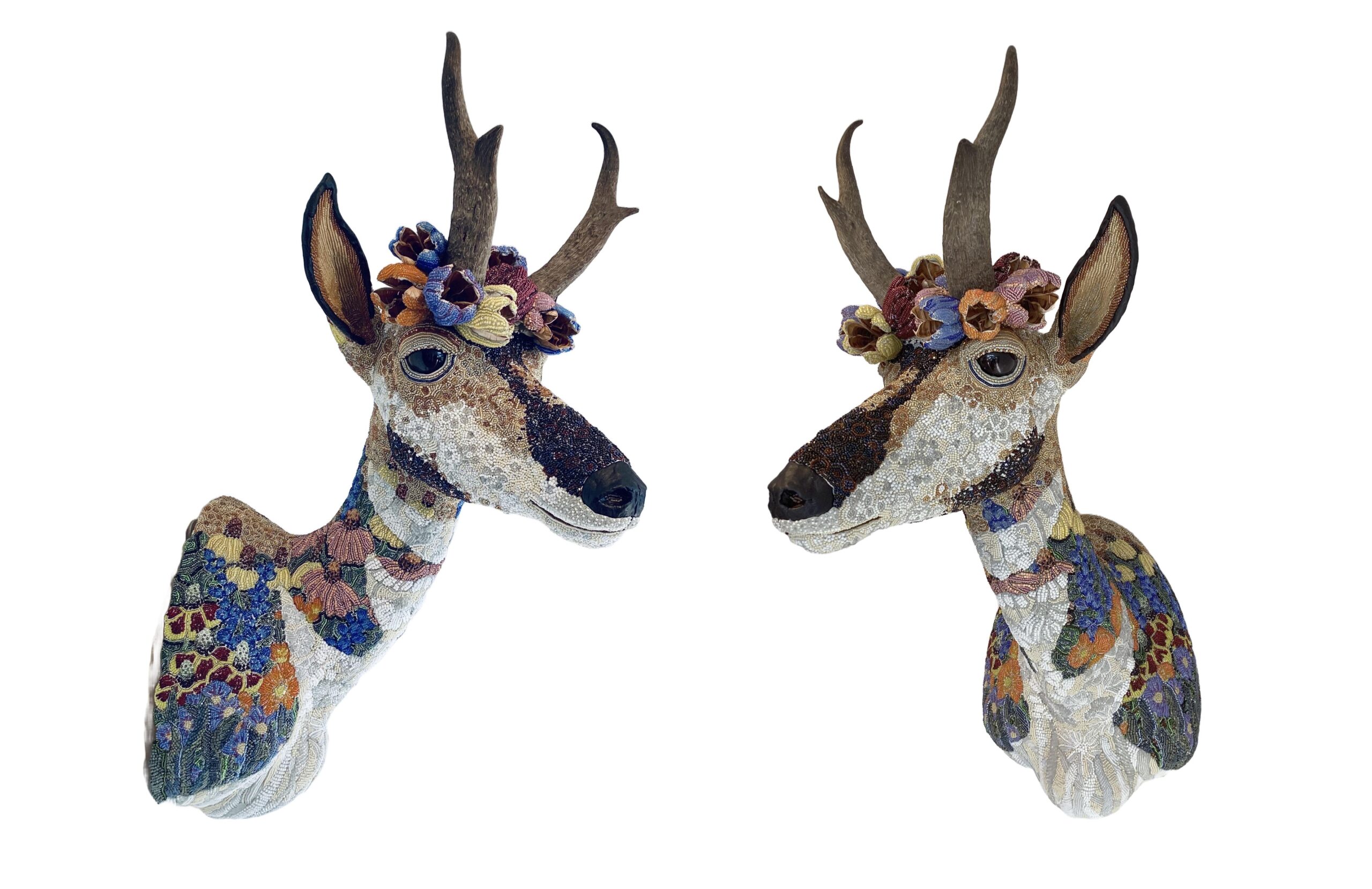 In addition to working in clay, I create unique animal head sculptures to hang on the wall like a trophy head. No animals are harmed in their creation! I cover the sculpted heads in mosaic-like patterns using beads and found objects such as seedpods, shells, rocks and glass, which are pressed into the clay. Originally, they were a representation of camouflage for protecting prey animals; the irony being that they might end up as a trophy on the wall anyway. I still think of the surface as camouflage but also as an outlet for my love of color and organic shapes, as well as the substrate onto which I sculpt branches, birds and more.