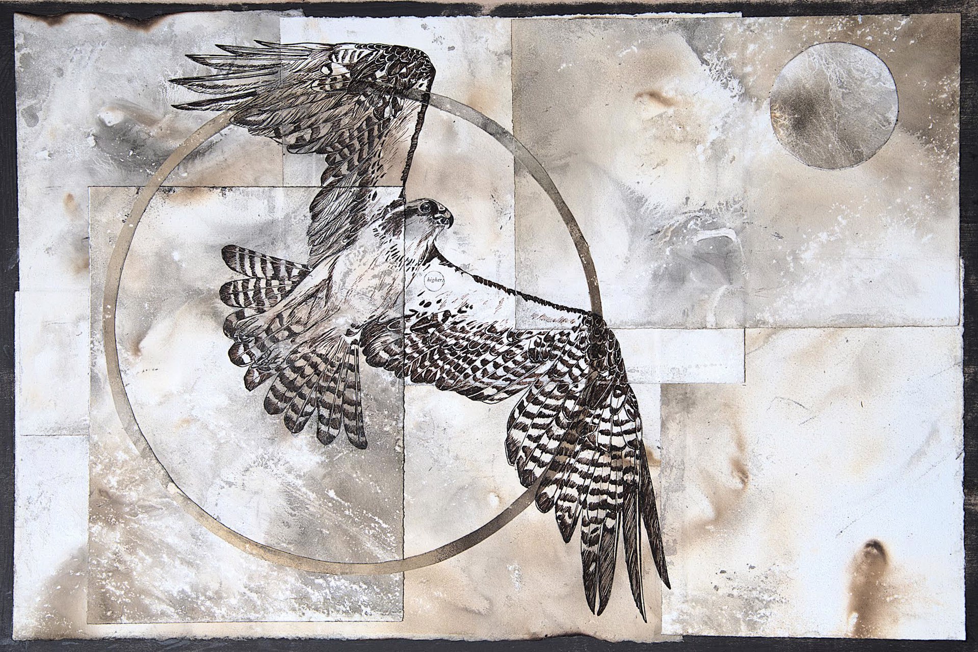 Acrylic, Ink, and Smoked Paper on Wood