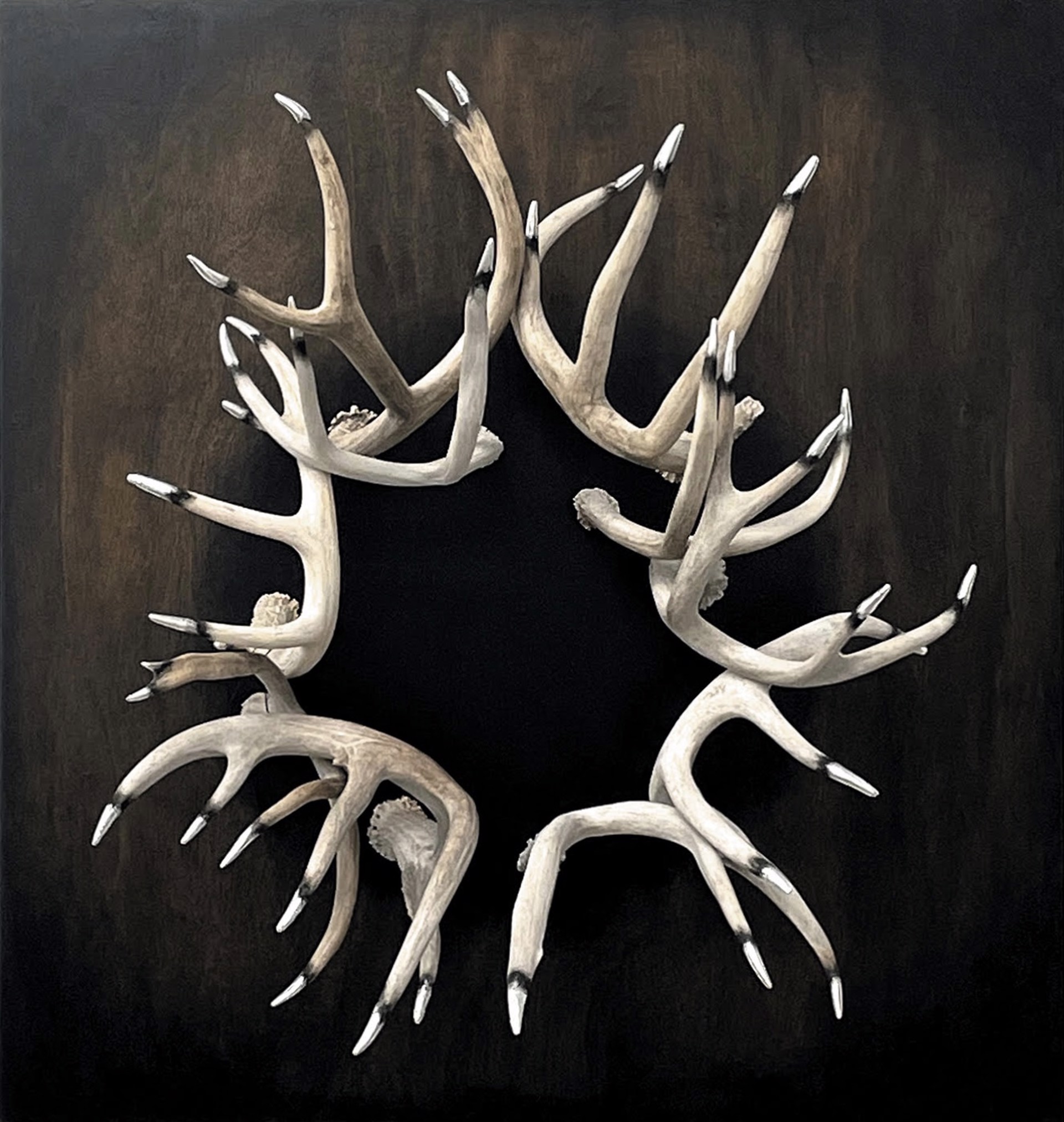 Deer Antlers, Charcoal, Silver Leaf on Wood